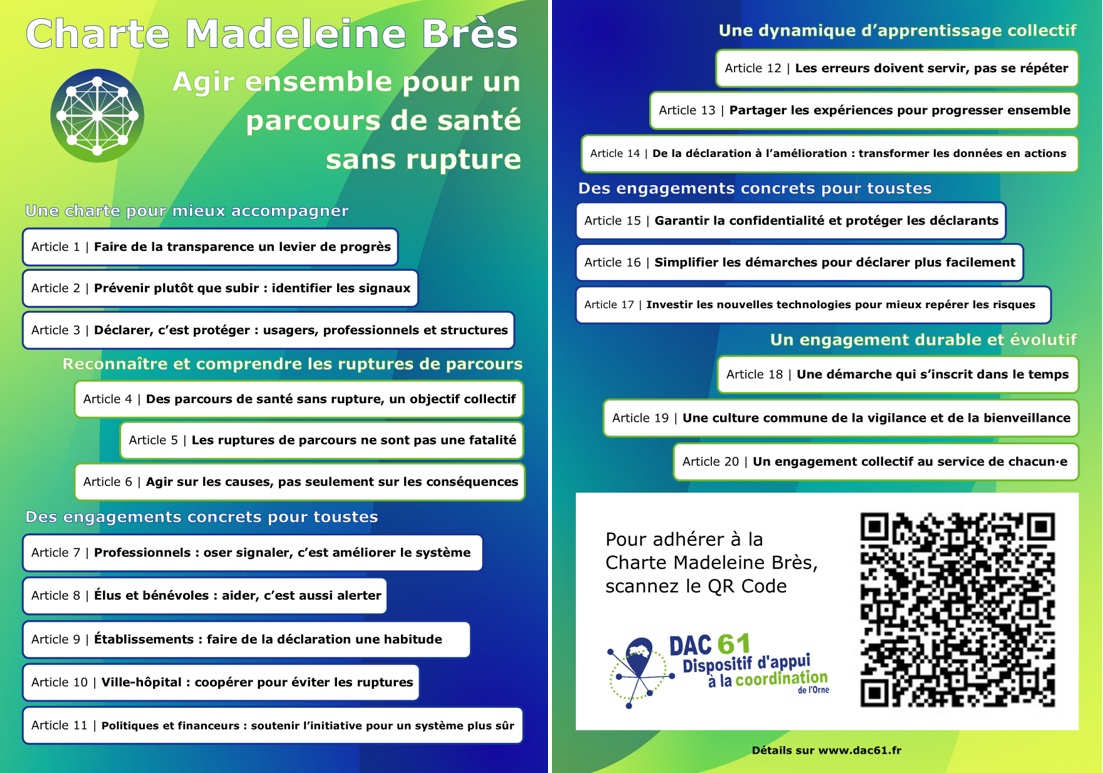 Suite à la création de l'Observatoire des ruptures de parcours du DAC 61, le Conseil d'Administration de l'association Appui Santé 61 d'octobre 2024 a validé le projet de construire une Charte visant à fédérer les acteurs impliqués dans les parcours de santé et lutter contre les freins à la déclaration des ruptures de parcours, similaires à ceux des déclarations d'évènements indésirables.
